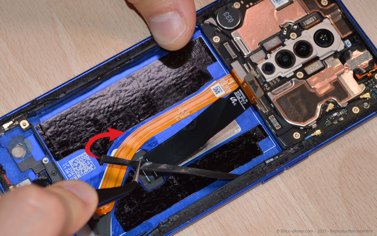 Tirez sur ces languettes afin d'ôter la batterie du téléphone. Retirez le sticker qui permet de maintenir la batterie en place dans le châssis.