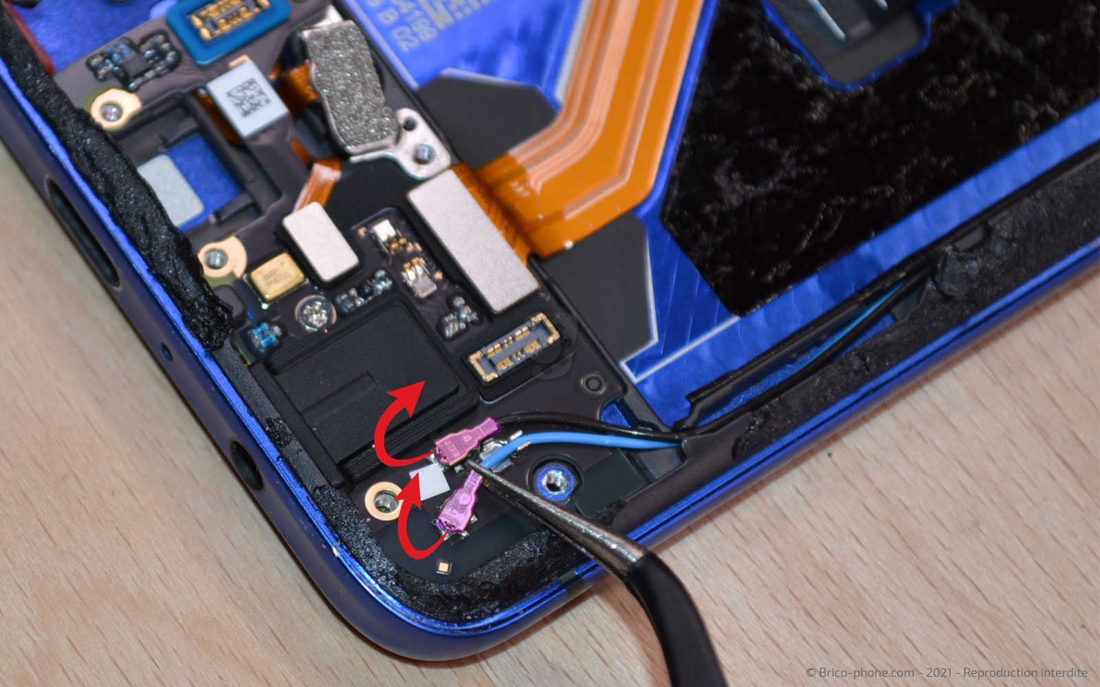 Ensuite, attaquez-vous à la nappe du connecteur de charge toujours sur la carte fille puis à celle située sur la carte-mère afin de récupérer le connecteur de charge.